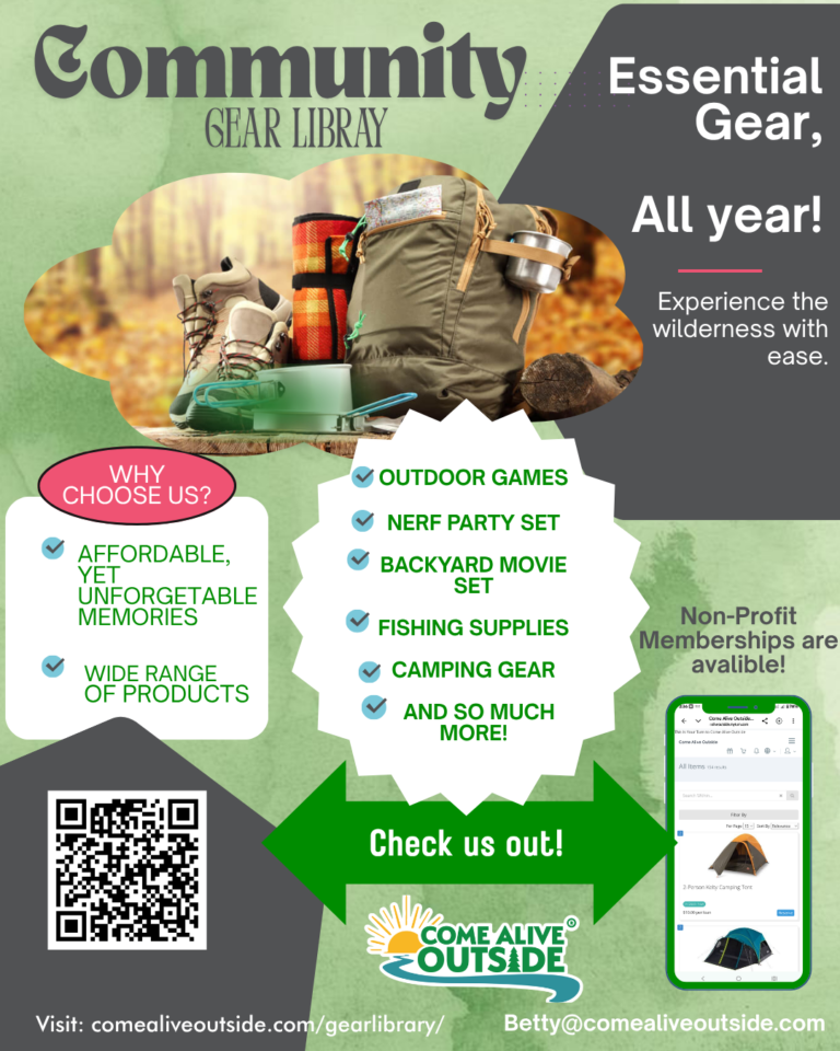 The Come Alive Outside Gear Library is a resource for anyone to borrow items they need to properly get outside!