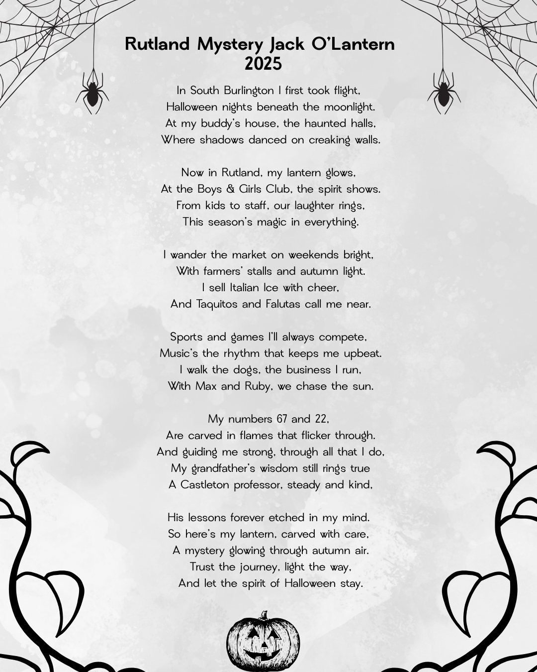 The nominee with the highest total score across all categories will be honored as the Mystery Jack O’ Lantern, representing the best of Rutland’s community spirit and Halloween traditions.